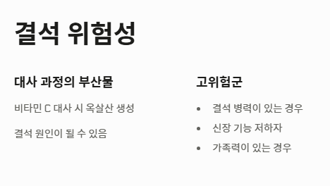 아무리 몸에 좋아도 과하면 문제가 됩니다. 고함량으로 비타민 C 하루 권장량 알아보기를 실천할 때 결석이 잘 생기는 체질이거나 신장 기능이 저하된 분들은 주의해야 합니다. 비타민 C 대사 과정에서 생성되는 옥살산 성분이 결석의 원인이 될 수 있기 때문입니다. 또한 평소 위염이나 식도염이 있다면 고함량 섭취 시 증상이 악화될 수 있음을 명심해야 합니다.
