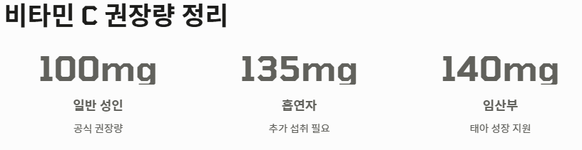 - 특수 상황: 흡연자, 임산부, 스트레스가 많은 현대인은 더 많은 양이 필요합니다.