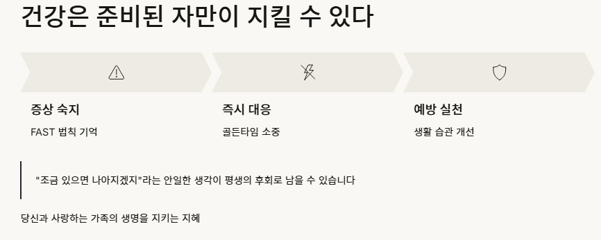 결론적으로 뇌졸중 전조증상은 우리 몸이 보내는 마지막 기회이자 경고입니다. "조금 있으면 나아지겠지"라는 안일한 생각이 평생의 후회로 남을 수 있습니다. 평소 자신의 혈관 나이를 점검하고, 증상을 숙지하여 위기의 순간에 냉철하게 대응하시길 바랍니다. 건강은 준비된 자만이 지킬 수 있는 가장 소중한 자산입니다.