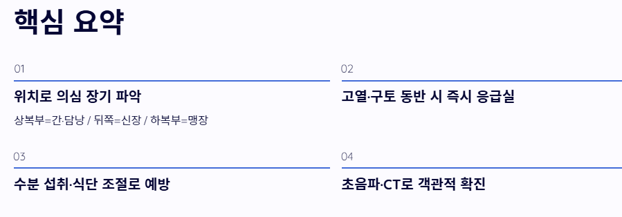 오늘 상세히 살펴본 오른쪽 옆구리 통증 의심되는병에 대한 핵심 내용을 정리합니다.