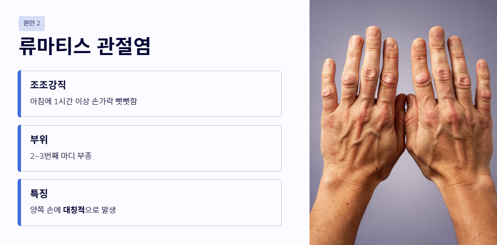 - 류마티스 관절염: 아침에 일어났을 때 손가락이 1시간 이상 뻣뻣한 '조조강직'이 나타나고, 두 번째 혹은 세 번째 마디가 붓는다면 면역 체계의 이상을 의심해야 합니다. 양쪽 손에 대칭적으로 나타나는 손가락 마디 통증이 특징입니다.