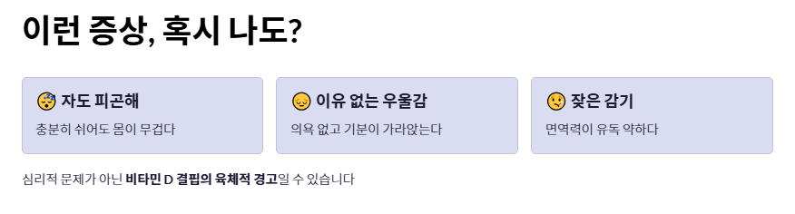 - 피로감, 뼈 통증, 우울감, 잦은 감기는 몸이 보내는 전형적인 비타민d 부족증상입니다.