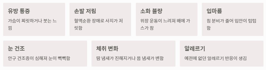 - 감정 기복: 이유 없이 눈물이 나거나 화가 치밀어 오름.