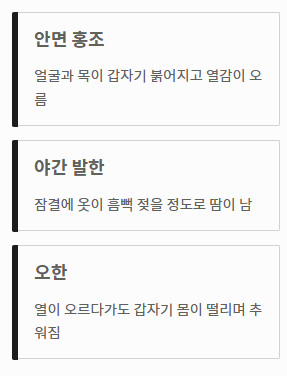 - 오한: 열이 오르다가도 갑자기 몸이 떨리며 추워짐.