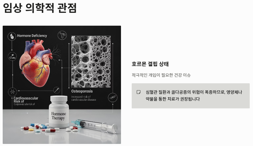 - 임상 의학적 관점: 이 시기를 '호르몬 결핍 상태'로 규정합니다. 갱년기 증상 30가지가 나타나는 것은 심혈관 질환과 골다공증의 위험을 폭증시키므로, 영양제나 약물을 통해 적극적으로 개입해야 한다는 시각입니다.