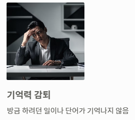 - 기억력 감퇴: 방금 하려던 일이나 단어가 기억나지 않음.