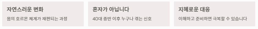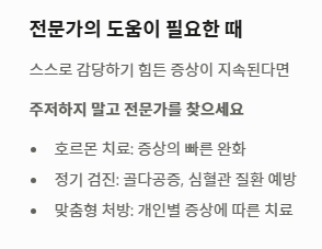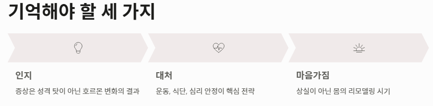 - 마음가짐: 갱년기 증상 30가지는 상실의 시기가 아니라, 건강한 노후를 위해 내 몸을 리모델링하는 시기입니다.