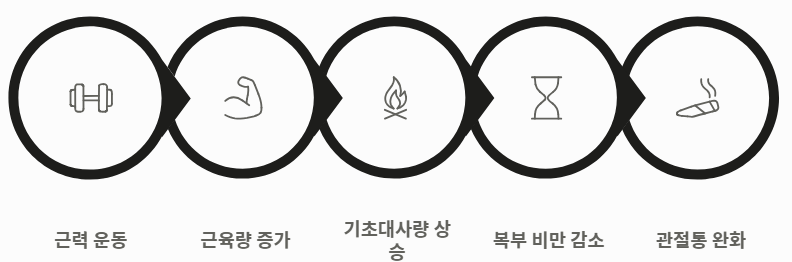 기초대사량이 떨어지면 갱년기 증상 30가지 중 하나인 복부 비만이 심해집니다. 운동을 통해 근력을 키우면 갱년기 증상 30가지에서 비롯되는 관절통도 줄일 수 있습니다.