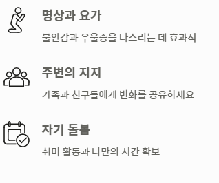 갱년기 증상 30가지 중 심리적인 우울감은 주변의 지지가 필수입니다. 명상은 갱년기 증상 30가지로 인한 불안감을 다스리는 데 큰 도움이 됩니다.