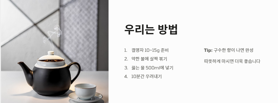 - 이뇨 작용 고려: 결명자는 소변 배출을 돕는 이뇨 작용이 강합니다. 따라서 수분 보충을 위해 생수 대신 마시기보다는 하루 1~2잔 '차'로서 즐기는 것이 좋습니다.