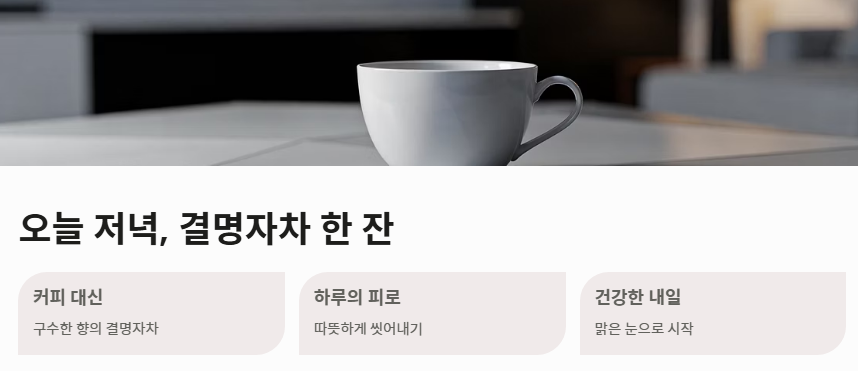 - 결론: 결명자차는 눈 건강을 지키는 훌륭한 파수꾼이지만, 본인의 체질과 혈압 상태를 고려하여 지혜롭게 마셔야 합니다.