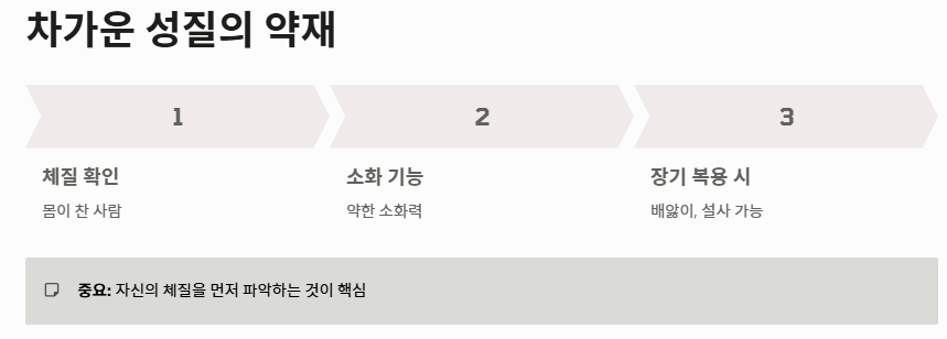 - 주요 부작용: 찬 성질로 인한 설사 유발 가능성, 저혈압 환자의 혈압 저하 우려가 있습니다.