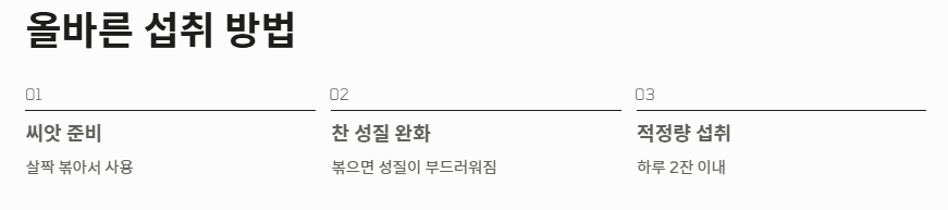 - 섭취 방법: 씨앗을 살짝 볶아서 사용하면 찬 성질이 조금 완화되며, 하루 2잔 이내가 적당합니다.