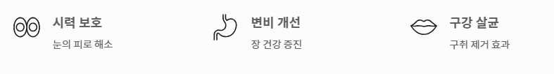 - 주요 효능: 시력 보호, 눈의 피로 해소, 변비 개선, 구강 내 살균 작용 등이 탁월합니다.