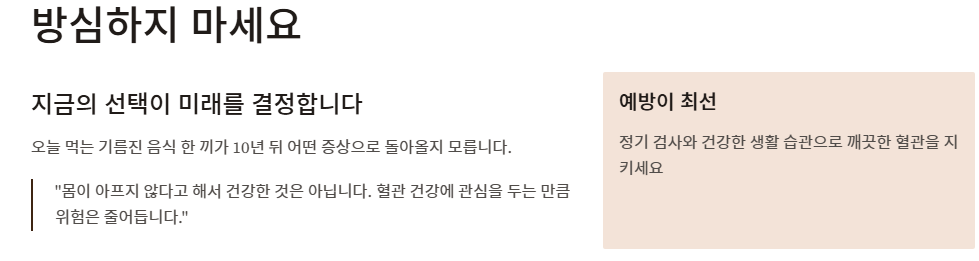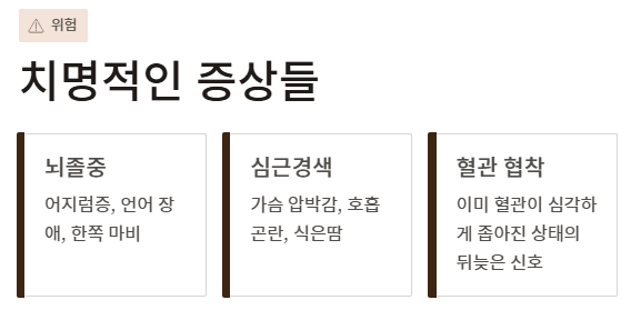 - 치명적인 증상: 가장 무서운 것은 뇌졸중이나 심근경색으로 발현되는 것입니다. 어지럼증, 가슴 압박감 등은 이미 혈관이 심각하게 좁아졌음을 알리는 뒤늦은 증상입니다.