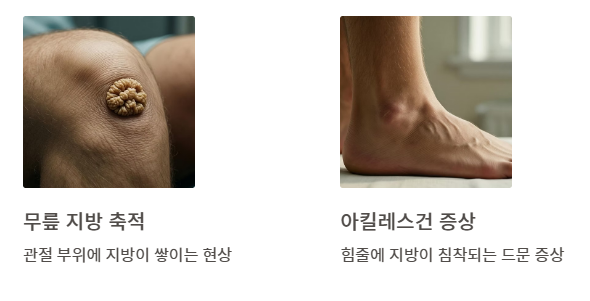 - 가시적인 증상: 아주 드물게 눈꺼풀 주위에 노란색 지방 주머니가 생기는 '황색판종'이나 무릎, 아킬레스건에 지방이 쌓이는 증상이 나타날 수 있습니다.