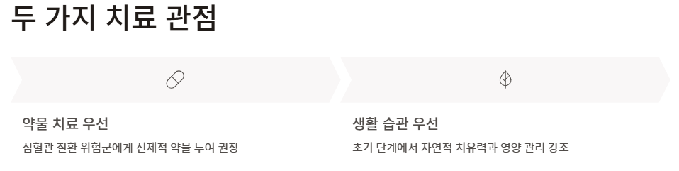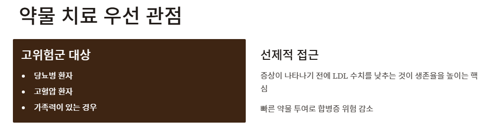 - 약물 치료 우선 관점: 심혈관 질환 위험군(당뇨, 고혈압 환자 등)에게는 생활 습관 개선보다 빠른 약물 투여를 권장합니다. 이들은 고지혈증 증상이 나타나기 전에 선제적으로 LDL 수치를 낮추는 것이 생존율을 높이는 핵심이라고 봅니다.