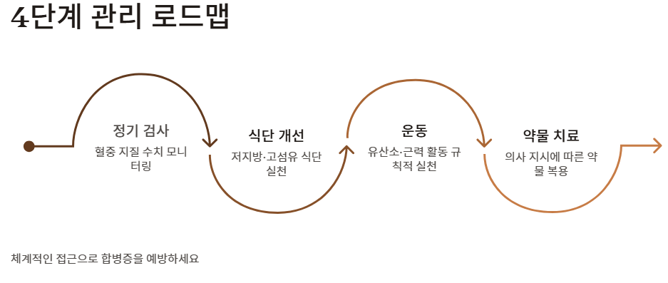 이미 수치가 높게 나왔거나 가족력이 있다면, 아래의 단계별 대응을 통해 고지혈증 증상이 합병증으로 번지는 것을 막아야 합니다.