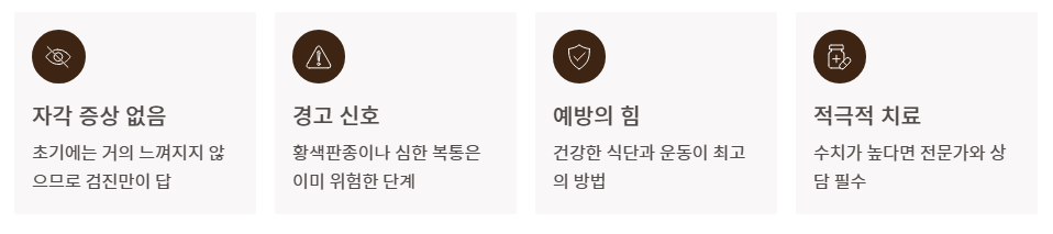 - 경고 신호: 황색판종이나 심한 복통이 있다면 이미 위험한 고지혈증 증상 단계일 수 있습니다.