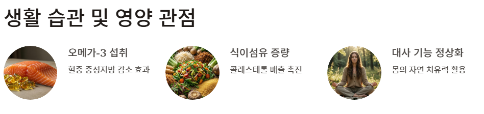 - 생활 습관 및 영양 관점: 반면 초기 단계에서는 약물 부작용을 우려하여 자연적인 치유력을 강조합니다. 오메가-3 섭취, 식이섬유 증량 등을 통해 몸의 대사 기능을 정상화하면 고지혈증 증상 없이 건강한 수치를 유지할 수 있다는 시각입니다.