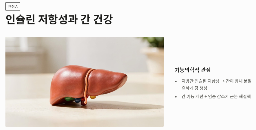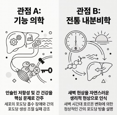 - 관점 A: "인슐린 저항성과 간 건강의 회복이 본질이다" 기능의학적 관점에서는 공복 혈당이 높은 이유를 간의 조절 능력 상실로 봅니다. 지방간이 있거나 인슐린 저항성이 높으면 간이 밤새 불필요하게 많은 당을 만들어냅니다. 따라서 간 기능을 개선하고 염증을 줄이는 영양학적 접근이 근본적인 공복혈당 낮추는 방법이라는 주장입니다.