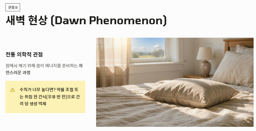 - 관점 B: "새벽 현상(Dawn Phenomenon)에 대한 과학적 대응이 우선이다" 전통 의학에서는 아침 혈당이 오르는 것을 신체가 잠에서 깨기 위해 에너지를 준비하는 자연스러운 과정으로 보기도 합니다. 다만 이 수치가 비정상적으로 높다면 약물 조절이나 취침 전 가벼운 단백질 간식(우유 반 잔 등)을 통해 오히려 간의 과도한 당 생성을 억제해야 한다는 관점에서 공복혈당 낮추는 방법을 제시합니다.