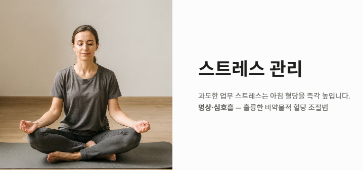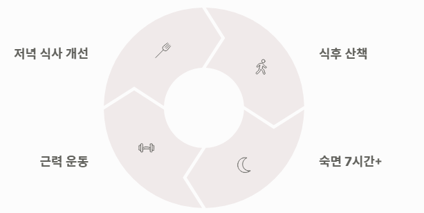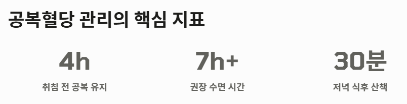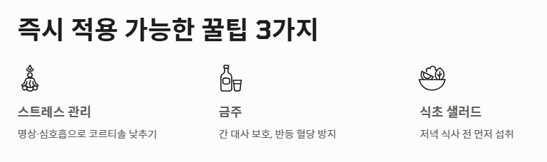 - 수면 부족과 스트레스는 호르몬 균형을 깨뜨려 혈당을 올리므로 숙면이 중요합니다.