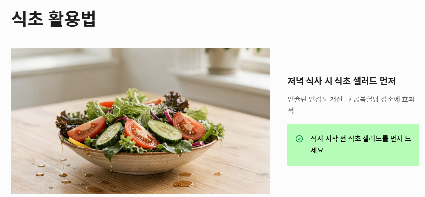 - 식초의 활용: 저녁 식사 때 식초를 활용한 드레싱이나 음료를 곁들이면 인슐린 민감도가 개선되어 공복혈당 낮추는 방법으로 유용하게 쓰일 수 있습니다.