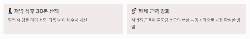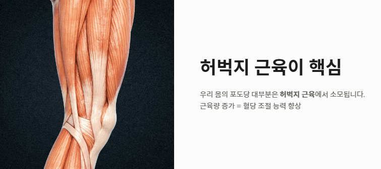 우리 몸의 포도당은 대부분 허벅지 근육에서 소모됩니다. 저녁 식사 후 30분 정도 가벼운 산책을 하면 혈액 속 당을 미리 소모하여 다음 날 아침 수치에 긍정적인 영향을 줍니다. 장기적으로 하체 근육량을 늘리는 것은 대사 능력을 키워주는 확실한 공복혈당 낮추는 방법이 됩니다.