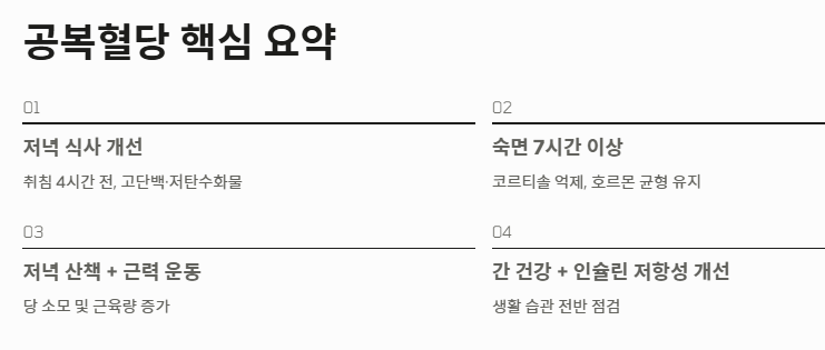 오늘 살펴본 공복혈당 낮추는 방법에 대한 핵심 내용을 정리합니다.