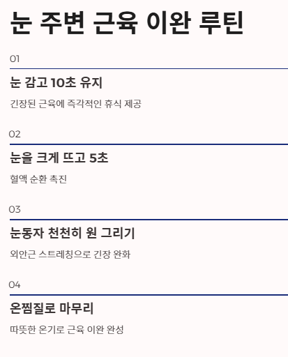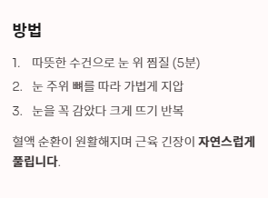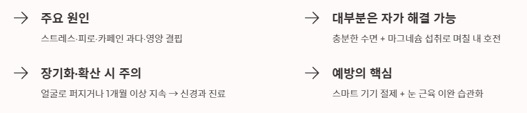 - 스마트 기기 사용을 줄이고 눈 주변 근육을 이완시키는 습관이 눈밑이 떨리는 증상 예방의 핵심입니다.