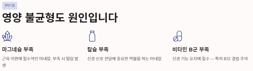 - 영양 불균형: 흔히 알려진 마그네슘 부족뿐만 아니라 칼슘, 비타민 B군이 부족할 때도 눈밑이 떨리는 증상이 빈번하게 나타날 수 있습니다.