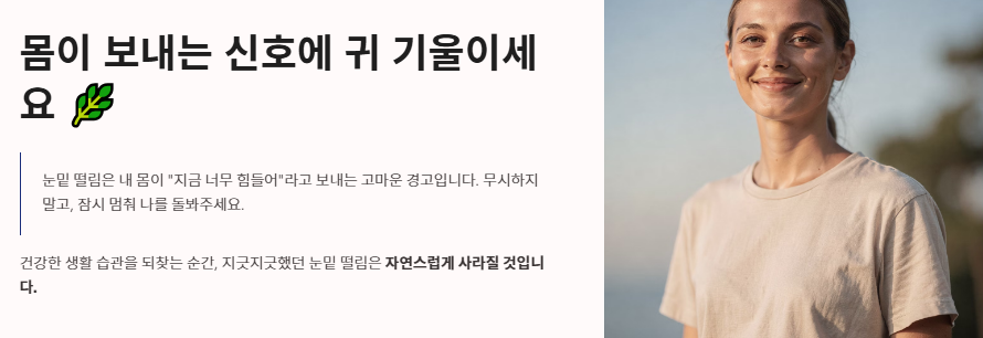결론적으로 눈밑이 떨리는 증상은 우리 몸이 지금 너무 힘들다는 것을 알려주는 고마운 신호입니다. 이를 단순히 무시하기보다는 내 삶의 궤적을 돌아보고 잠시 멈춰 서라는 메시지로 받아들여 보세요. 건강한 생활 습관을 되찾는 순간, 지긋지긋했던 눈밑이 떨리는 증상은 자연스럽게 작별을 고할 것입니다.