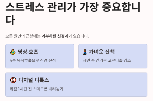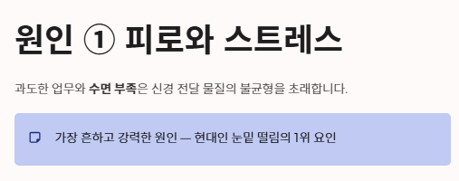 - 피로와 스트레스: 과도한 업무와 수면 부족은 신경 전달 물질의 불균형을 초래하여 눈밑이 떨리는 증상을 유발하는 가장 큰 원인이 됩니다.