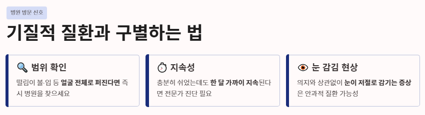 - 범위 확인: 떨림이 눈 주위에만 머물지 않고 볼, 입등 얼굴 전체로 퍼진다면 병원을 찾으세요.
