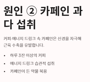 - 카페인 과다 섭취: 커피나 에너지 드링크 속 카페인은 신경을 자극하여 근육의 수축을 유발하며 눈밑이 떨리는 증상을 악화시킵니다.