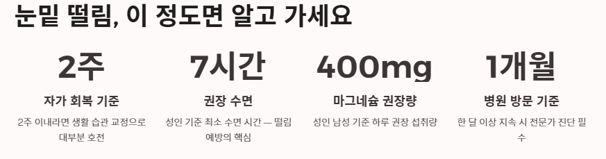 - 대부분의 눈밑이 떨리는 증상은 충분한 수면과 마그네슘 섭취로 며칠 내에 호전됩니다.