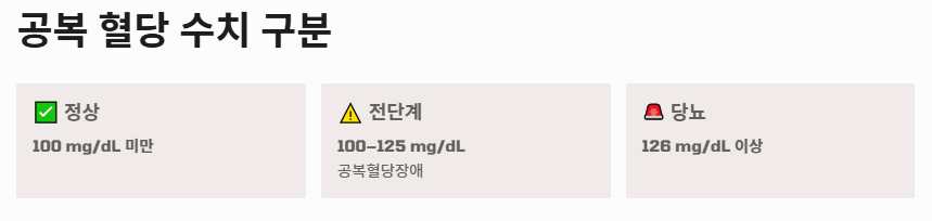 - 1단계: 공복 혈당 기준: 8시간 이상 금식 후 측정하는 수치입니다. 100mg/dL 미만이 정상이며, 126mg/dL 이상이면 당뇨로 진단합니다. 그 사이인 100~125mg/dL는 공복혈당장애(당뇨 전단계)로 분류되는 수치입니다.