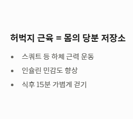허벅지 근육은 우리 몸의 '당분 저장소'입니다. 스쿼트와 같은 하체 근력 운동은 인슐린 민감도를 높여 공복 수치가 당뇨 수치 기준 이내로 들어오도록 돕습니다. 식후 15분 정도 가볍게 걷는 습관도 잊지 마세요.