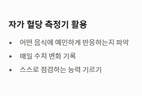 - 자가 측정을 통해 자신의 상태가 당뇨 수치 기준에 부합하는지 꾸준히 확인해야 합니다.
