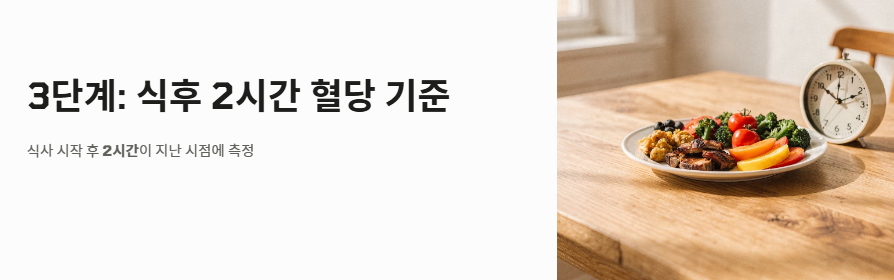 - 3단계: 식후 2시간 혈당 기준: 식사 시작 2시간 후 측정하며, 140mg/dL 미만이 정상입니다. 200mg/dL를 넘어서면 당뇨로 판정하며, 140~199mg/dL는 내당능장애로 분류되는 중요한 당뇨 수치 기준입니다.