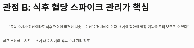 - 관점 B: "식후 혈당 스파이크 관리가 초기 대응의 핵심이다" 최근에는 공복 수치가 정상이라도 식후에 당이 급격히 치솟는 현상을 경계해야 한다는 목소리가 높습니다. 초기 대응 시기에 식후 수치를 엄격한 당뇨 수치 기준 내로 묶어두어야 췌장의 기능을 오랫동안 보존할 수 있다는 주장입니다.