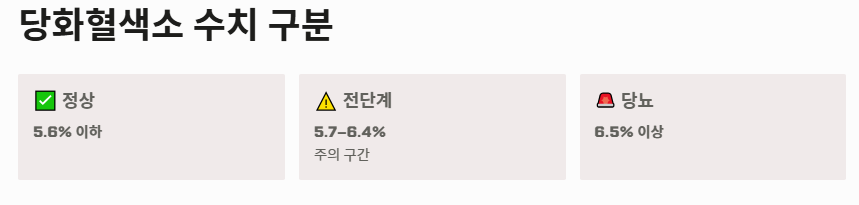 - 2단계: 당화혈색소(HbA1c) 기준: 지난 2~3개월간의 평균 혈당을 나타내는 가장 정확한 지표입니다. 5.6% 이하가 정상, 6.5% 이상이면 당뇨입니다. 5.7~6.4% 구간은 주의가 필요한 전단계 당뇨 수치에 해당합니다.