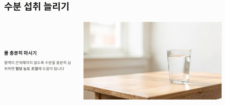 - 수분 섭취 늘리기: 혈액이 끈적해지지 않도록 물을 충분히 마시는 것이 혈당 농도 조절에 도움을 줍니다.