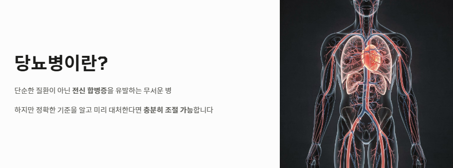 "어느 날 갑자기 찾아오는 심한 갈증과 이유 없는 체중 감소, 혹은 건강검진 결과지에 찍힌 낯선 숫자들 때문에 가슴이 덜컥 내려앉은 적 있으신가요? 우리 몸이 인슐린이라는 조절 장치를 잃어버리고 혈액이 설탕물처럼 끈적해지고 있다는 신호, 그 정확한 판별 기준을 모른다면 당신의 혈관은 지금 이 순간에도 소리 없이 무너지고 있을지 모릅니다."