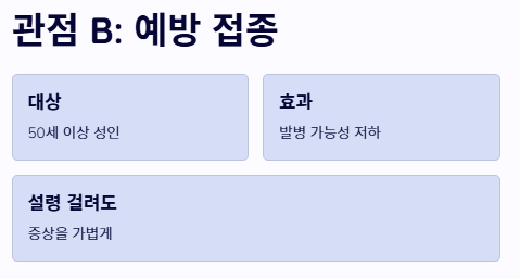 - 관점 B: '예방 접종을 통한 근본적 차단'의 강조 이미 대상포진 초기증상이 나타난 후에는 고통을 피하기 어렵습니다. 따라서 50세 이상 성인이라면 백신 접종을 통해 발병 가능성을 낮추고, 설령 걸리더라도 증상을 가볍게 넘기는 것이 가장 현명한 대상포진 초기증상 대처법이라는 주장입니다.