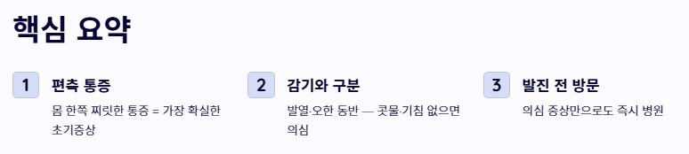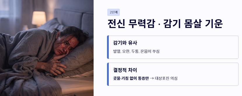 - 감기 몸살과 비슷한 발열과 오한이 동반될 수 있어 단순 감기와 구분이 필요합니다.