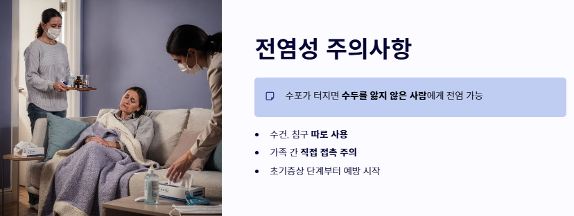 - 전염성 주의: 수포가 터지면 진물 속 바이러스가 수두를 앓지 않은 사람에게 전염될 수 있습니다. 대상포진 초기증상 단계부터 수건을 따로 쓰는 등 가족 간 접촉에 주의해야 합니다.