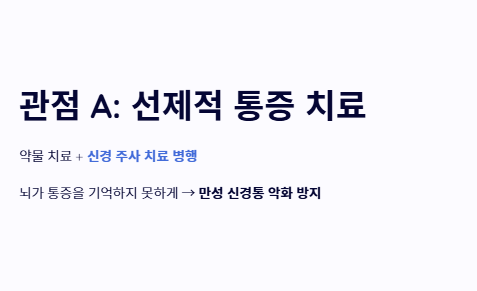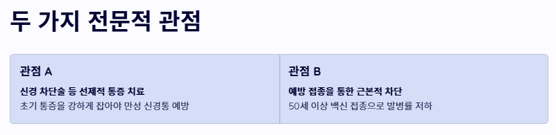 - 관점 A: '신경 차단술 등 선제적 통증 치료'의 중요성 단순히 약만 먹는 것이 아니라, 대상포진 초기증상이 나타났을 때 적극적으로 신경 주사 치료를 병행해야 한다는 입장입니다. 초기 통증을 강하게 잡아주어야 뇌가 통증을 기억하지 못해 만성적인 신경통으로 악화되는 것을 방지할 수 있다는 관점입니다.