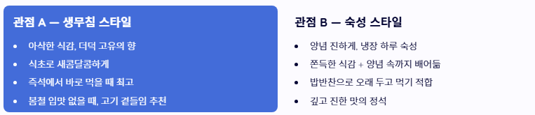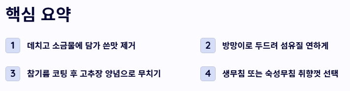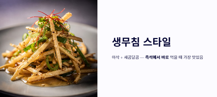 - 취향에 따라 새콤한 생무침이나 진한 숙성무침 중 선택하여 조리합니다.